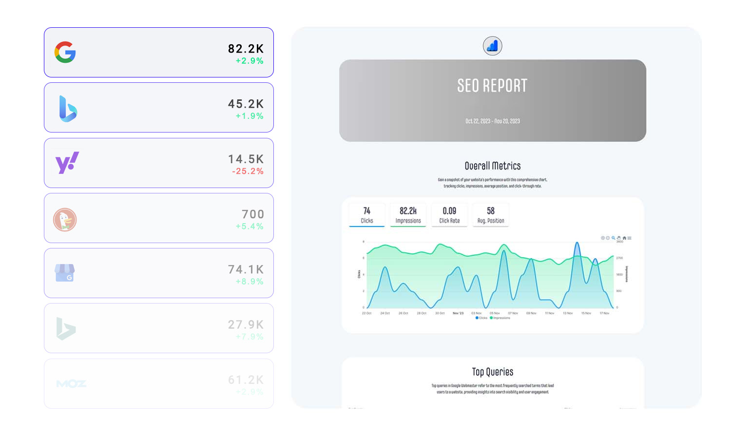 Impress your clients with visually appealing and interactive SEO reports that reflect your agency’s commitment to excellence. SEO Metrics transforms raw data into engaging insights, allowing you to present results in a way that captivates and informs. Customize reports to match your branding, highlight key metrics, and demonstrate the value of your services. Elevate your client relationships by delivering reports that not only meet but exceed expectations, positioning your agency as a leader in the competitive digital marketing landscape.